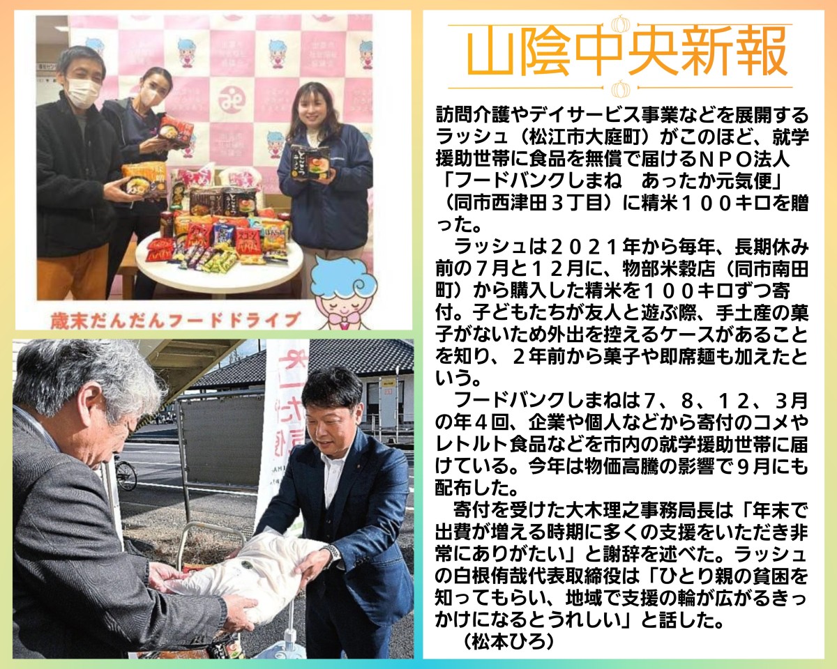 さて毎年恒例となりました、出雲・松江でのフードバンクさんへの寄付を行いました!